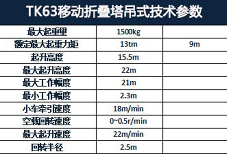折叠移动塔式起重机(简称塔式起重机)是指安装、架设或拆卸、转运非常快捷,装拆过程可以依靠自身机构进行,而不必借助外部起重设备的一种塔机起重设备,一般可在1~2个小时左右完成,适合低层、独幢式建筑等方面的建设。